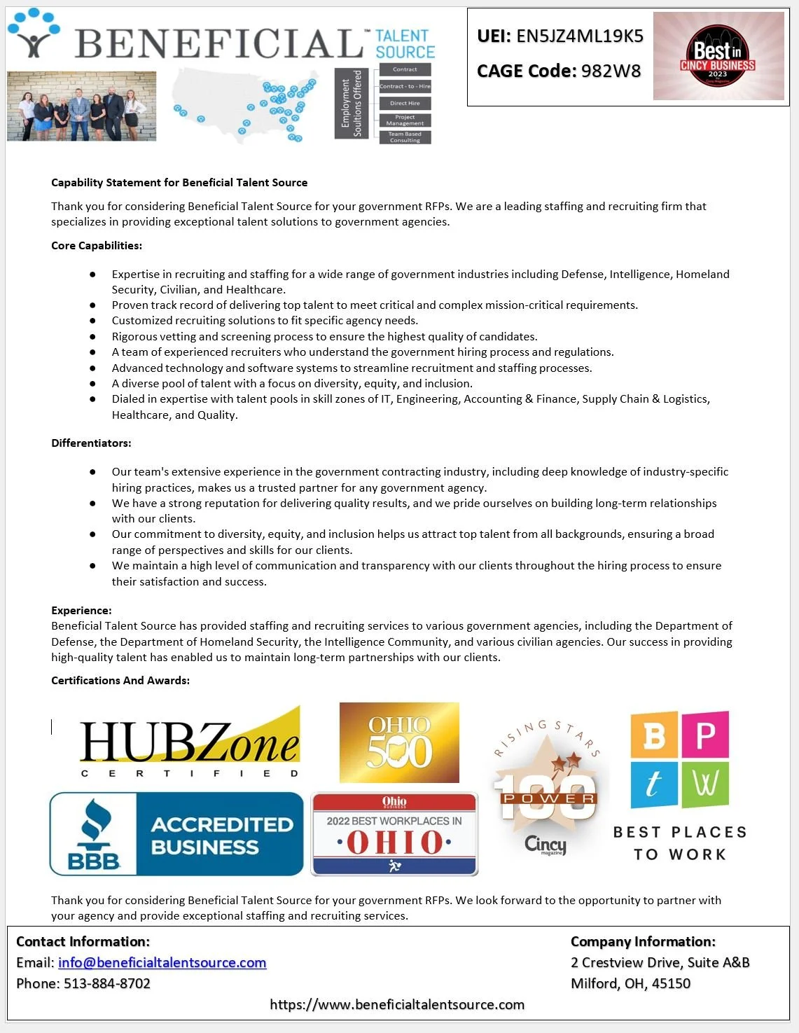Beneficial Talent Source is a leading staffing and recruiting firm that specializes in providing exceptional talent solutions to government agencies. Our success in providing high-quality talent has enabled us to maintain long-term partnerships with our clients.
